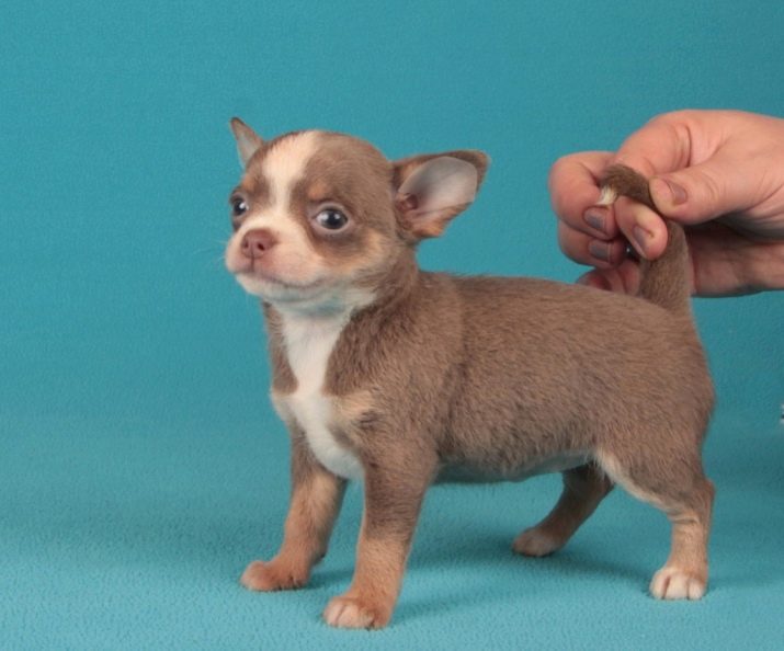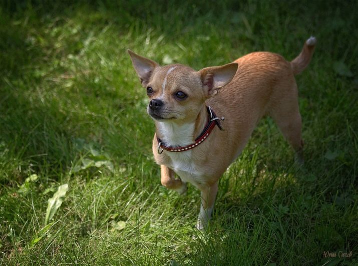 Chihuahua is distinguished by an elongated stocky body, a long elastic neck and head, which resembles an apple in shape. On her head she has disproportionately large erect ears, on her muzzle there are large expressive eyes of a dark color and an upturned nose, which can be any color: black, pink or beige. A medium-sized tail is raised or has a curl almost touching the back. The tail can also be lowered in a semicircle.