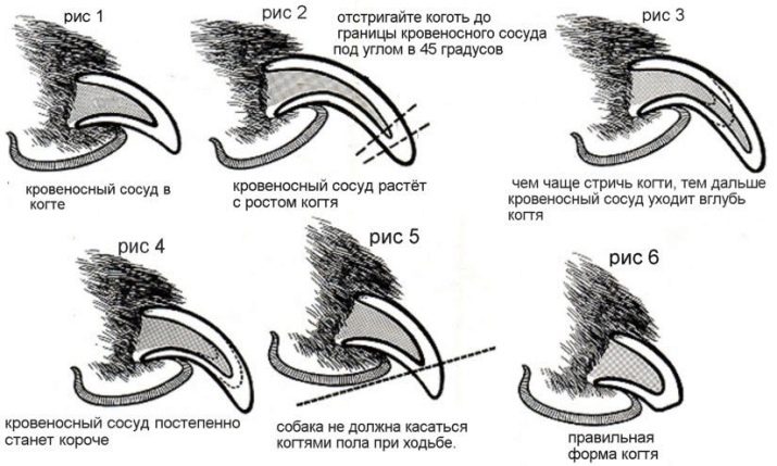 On dark claws, the process of trimming an overgrown claw takes longer. No more than 2 mm is trimmed at a time. Shortening is performed in several stages, each time the edge is inspected. When a darkened area appears in the form of a dot in the center, it is worth stopping: further there is the pulp, affecting which, you can cause bleeding.