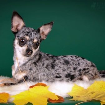 The color of Merle (it is also called Marble) looks quite expressive and catchy, but it is strictly forbidden by the Chihuahua breeders. The color is expressed by not very uniform pigmentation of the wool, on which there are spots of a dark gray or, in general, beige shade. The eyes are usually light blue or dark blue. Deviations of this kind are caused by the predominance of the M gene.