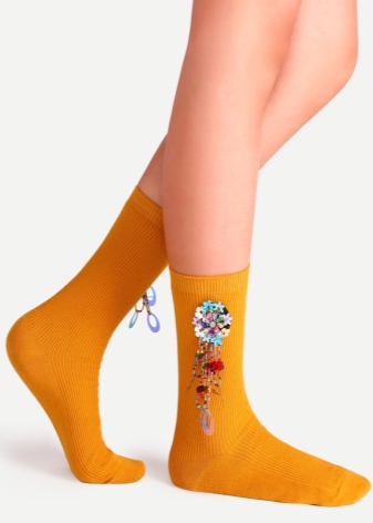 Fashionable socks are decorated with appliqués, rhinestones, inserts from other materials, lurex. They can be made of natural and synthetic materials, have a classic design or resemble leg gloves with a compartment for each toe. They can be monochrome, multi-colored and printed.