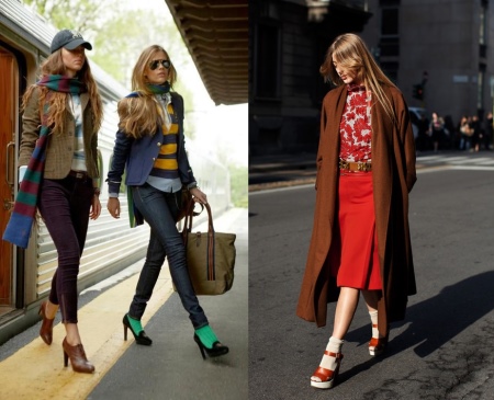 Bright green socks will be a great addition to everyday life along with tight jeans, a shirt and a sweater. A special chic - socks are worn under elegant high-heeled shoes, which until recently seemed to be tasteless. A stylish image will be complemented by a carelessly tied scarf and a massive bag.