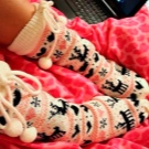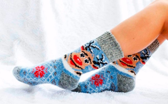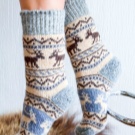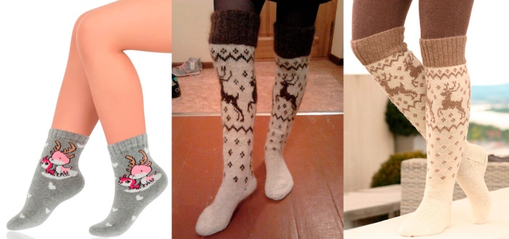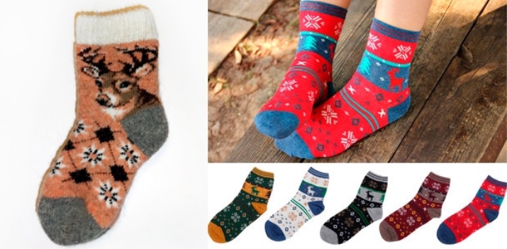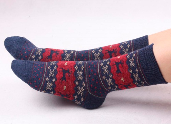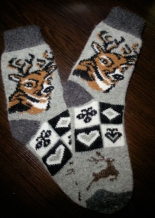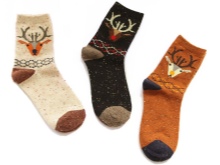 Socks with deer are knitted from woolen threads. Therefore, they are warm and reliably protect your feet from the cold. They warm their legs quickly enough, especially after a long stay in the cold.