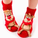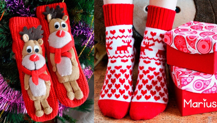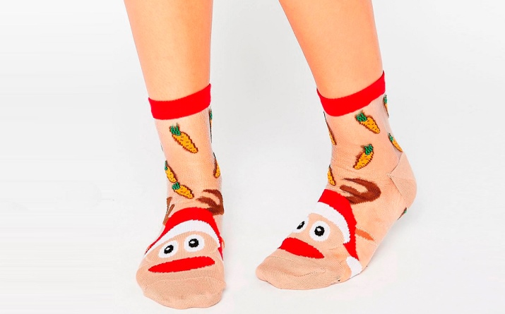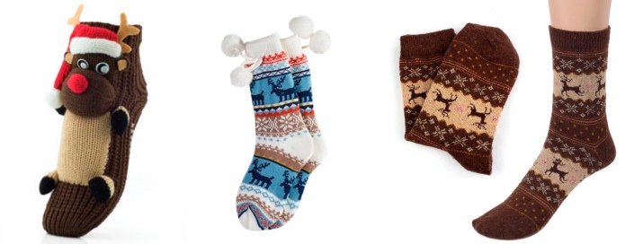Sometimes the design is a classic sock with a monophonic base, a white toe imitating the face of a deer, and decorative horns made of black textile. Embroidery is usually located on the toe: eyes, nose, smile.