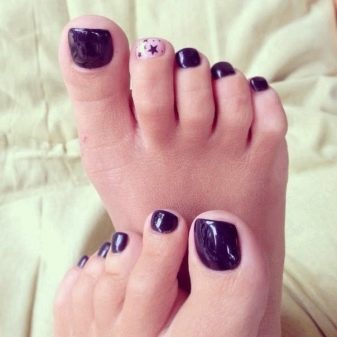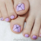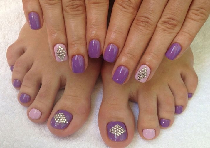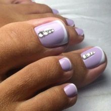 An interesting option would be a matte lilac pedicure. To give the coating a decorative effect, it is necessary to use colored or plain rhinestones of different sizes. You can arrange them on the surface of the nail in any order. If there are a lot of stones used, then the base coat should remain monophonic, otherwise the original nail design will be hopelessly damaged.