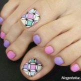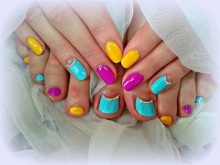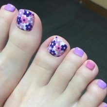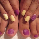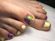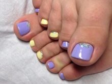 The lilac-yellow pedicure assumes that the lilac shade is basic, it covers the entire nail plate, and the yellow shade has a decorative function and is applied in the form of geometric shapes or small patterns (hearts). Due to the fact that the yellow varnish is quite bright, the patterns must be applied as carefully as possible, forming clear boundaries. The outer edge is acceptable to decorate with small rhinestones. Rhinestones in a zone of growth of nails on all fingers or on one (big) will be appropriate.