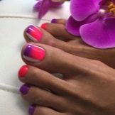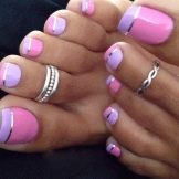 Lilac shade is suitable for the French pedicure. It covers the main area of the nail, and the edge can be painted in any tone. To give the classic French pedicure new notes, the main tone is chosen matte texture, and the second - shiny. You can complement the composition with decorative shiny ribbons (gold, silver), placing them over the entire area of the nail or only in the growth zone in several rows. If you want your nails to look bright, then shiny golden-silver shades can be replaced with brighter colors.