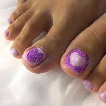 Violet pedicure with stones involves monophonic coating of the nail plate and decorating it with colored pebbles (green, crimson, deep blue) of large sizes. Elements can be placed in the center of the thumbnail. Around it is allowed to arrange a few smaller stones, colored or plain. Nails on the remaining fingers can be decorated with glitter of gold and silver tones.