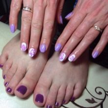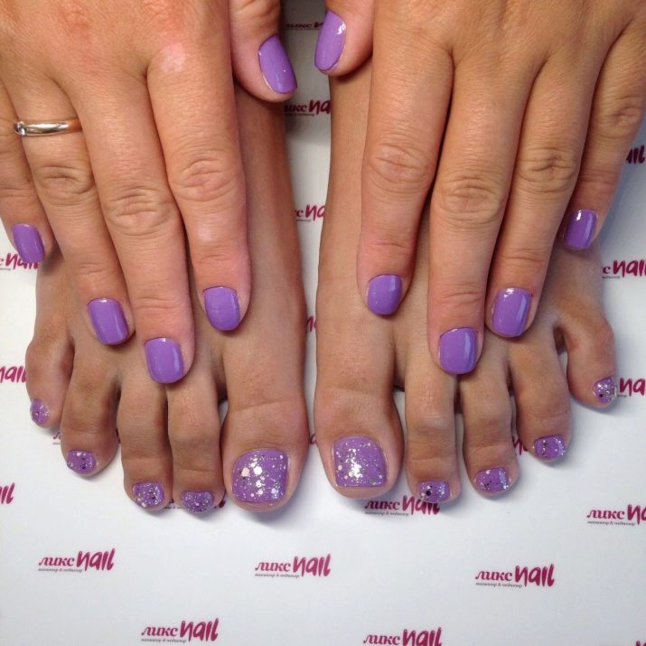 The light purple hue is self-sufficient and does not need additional decorations, therefore, it’s quite easy to make a beautiful pedicure by simply covering your nails with a plain varnish of this tone. But specialists in the field of decoration cannot be stopped, so nails are often decorated with rhinestones, art paintings in the form of interesting ornaments or flowers, glitters, acrylic powder (to create three-dimensional patterns) and decorative sand.