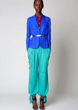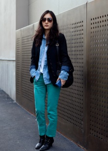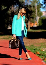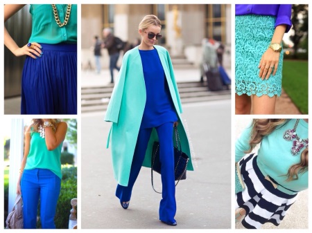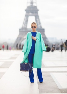- For an elegant combination, two colors will suffice: saturated blue trousers, a top and a bag complete with a spectacular turquoise coat.