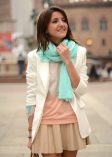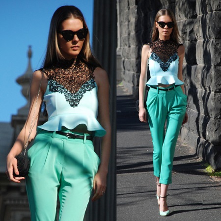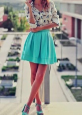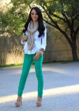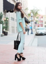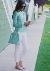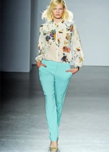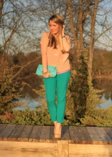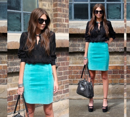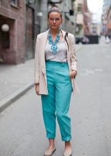 For turquoise trousers and skirts, you need to choose a calm top. Win-win colors: white, flesh, delicate powdery shade. It can be a silk blouse, a cotton shirt, a knitted sweater or a knitted top. Avoid tight trousers and skirts in turquoise if you have a full bottom, as the color will only aggravate the situation.