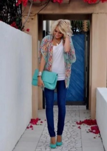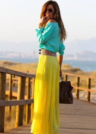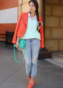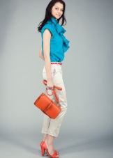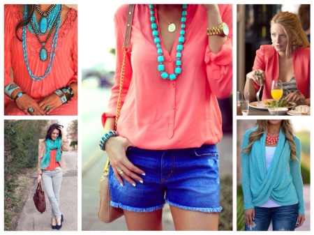 - For relaxation, you can choose even more bold colors: denim shorts with a coral top and a beige bag are shaded with bright turquoise accessories - a necklace and a bracelet.