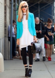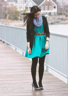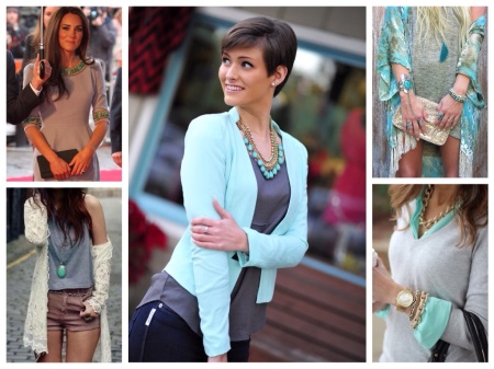 - Grey. Good, if not the main element. It should be less than turquoise, then the image will look harmonious. A belt, slippers, pockets of gray color - these are the best combinations.
