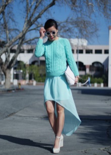It looks great as an independent unit. It can be both summer, light, flying, and a cocktail sheath dress or a luxurious evening outfit. A delicate turquoise shade looks amazing on brides as a wedding dress.