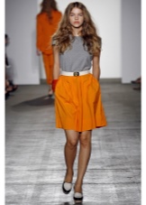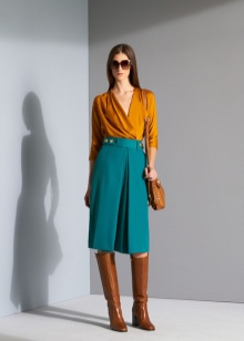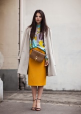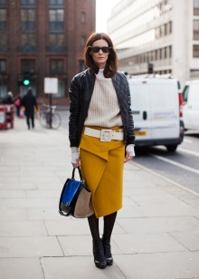 - When choosing a mustard shade skirt, you should pay attention to the universal pencil model.You can choose a strict snow-white blouse or shirt for such a model, as well as a top and cardigan in black and dark purple for a less official look. No less interesting in this color scheme is a skirt to the knee with an extension to the lower edge, which can be worn with boots in brown shades. In summer, tall girls can choose a pleated maxi length.