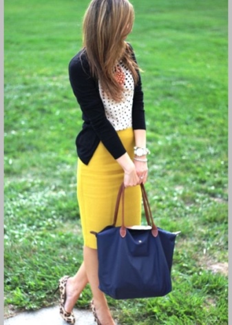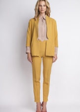 - The same story is suitable for the union of this color with black, against which the color of mustard looks bright and carries warmth. If corporate ethics allows, you can pick up a good business bow with these flowers, the union of which has already become a classic. In addition, you can arrange the colors in warm suits and sweaters in case of cold weather. In addition, an evening outfit in such a color scheme will look very attractive. If the case allows, then you can add a third color to this tandem - burgundy, emerald green or terracotta, as well as white or beige - this will fully reveal the mustard shade.