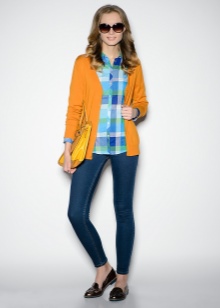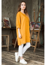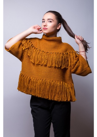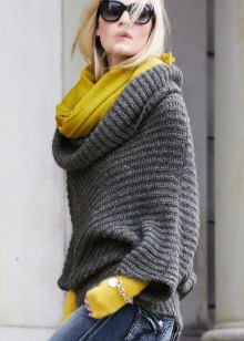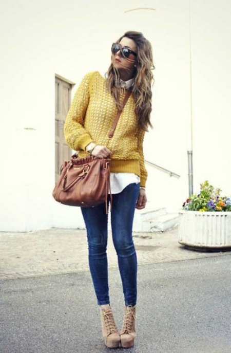 For an everyday look, you can choose an oversized yellow mustard color sweater, from under which you can see a snow-white shirt of a free cut. This top looks good with tight jeans and beige lace-up ankle boots. A voluminous and practical brown cross-body bag harmoniously complements a casual look.