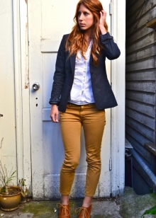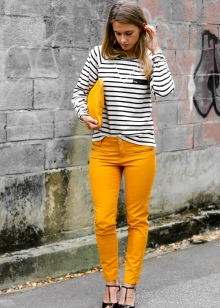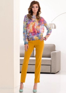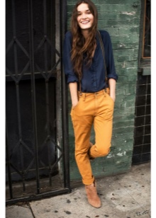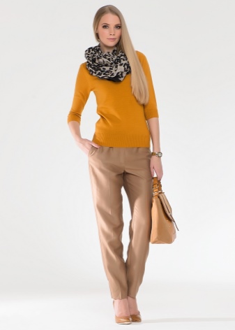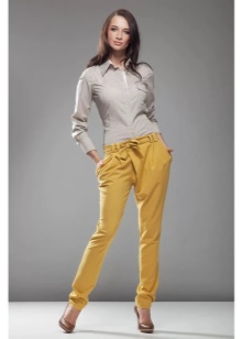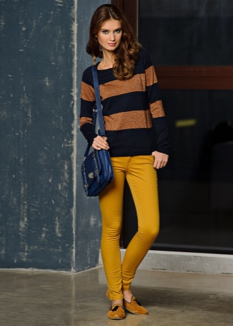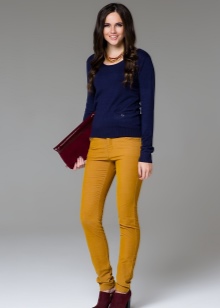 - Mustard-colored trousers can become a part of a business look if they have a classic cut. In this case, you can choose a black or white top in accordance with the requirements of office style and feel free to go to the meeting. Tight-fitting trousers of this color can be worn with pullovers or leather jackets, complementing the look with fashionable snow-white casual shoes.