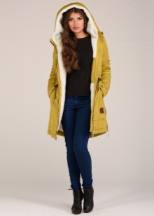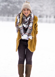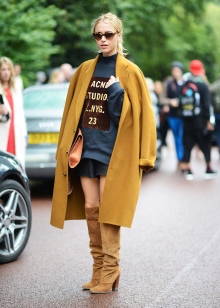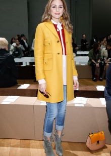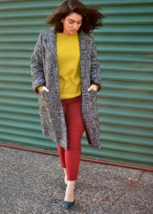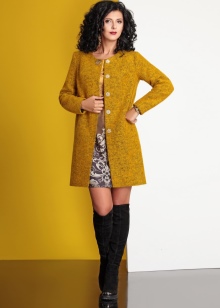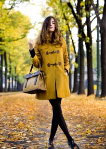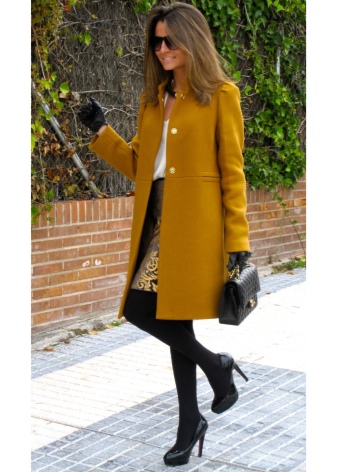- For many, the mustard palette is associated with autumn time, so it is ideal for outerwear during the off-season. For a straight cut coat, it is worth choosing brown trousers or classic jeans, shoes or boots can be chosen as shoes.