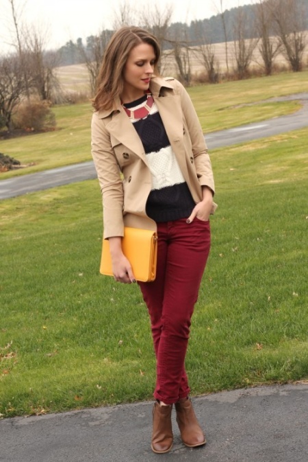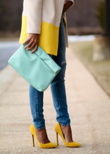 The accessory of the mustard palette is able to re-emphasize the image. Fitted wine-colored trousers, a black and white sweater and a beige jacket will sparkle with new colors, if you add to them a decent size clutch of mustard color.