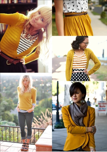 For fair-haired girls, faded and unsaturated mustard shades will be more preferable, while fashionable women with dark hair can choose any even the most juicy shade. And correctly selected accessories will make up an unforgettable image.