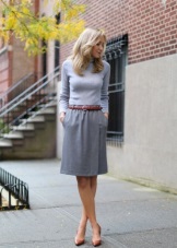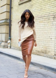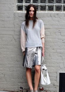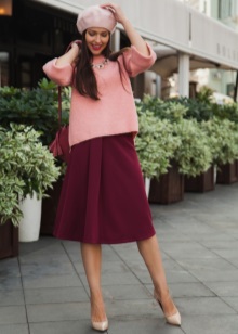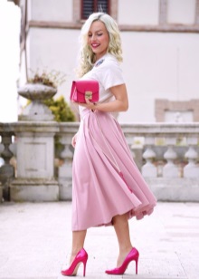 This image is made using a combination of complementary colors. Muted shades of blue in a sweater and lilac in a handbag are chosen well and make a fashionable pink pencil skirt a bright accent of the whole image. In this outfit, you can go to the cinema or cafe on a warm summer evening.
