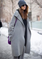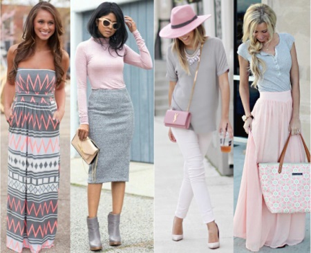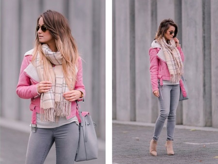 The combination of gray and pink is one of the winning color schemes for blonde girls. A gentle casual style with a jacket of a muted pink hue and voluminous stole, as if casually wound around the neck.