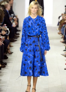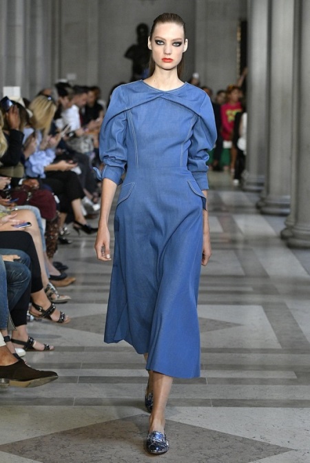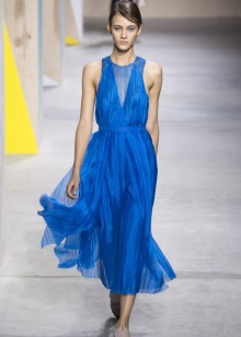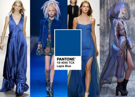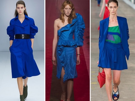 - Blue lapis lazuli. Deep and saturated blue color, reminiscent of the color of a dark turbulent sea on a rainy day with blueberry or plum notes, is popular in the spring-summer collections of fashion houses. The outfits of this blue shade will emphasize the graceful curves of the body, and at the same time will become a bright and stylish solution to the female image.