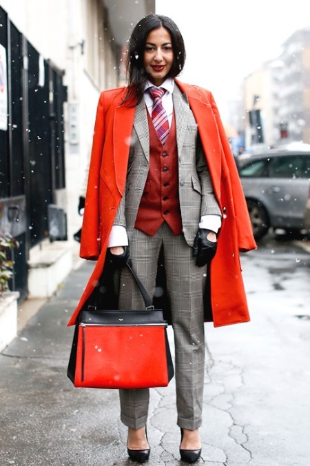 For stricter office outfits, you can choose an alternative in the form of a coat of a trendy red shade - because everyone in the office takes off their outer clothing, under which there will be an official strict check suit in neutral gray tones.