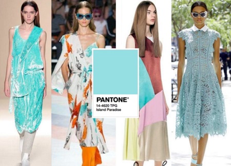 - Island paradise. A gentle and at the same time cold shade of blue with a turquoise tint is similar to the shade of an agave flower or sky blue. Perfect for weightless summer chiffon dresses or a bright coat for a spring walk. Sensual ice with aquamarine notes in this shade will add femininity and airiness to the image.