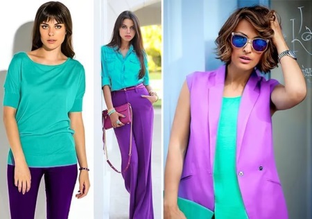 Not only two, but also three colors / shades adjacent in the color wheel can be combined. For example, to violet, lilac in combination with blue, you can add blue. Some are limited to the choice of two colors, since such a solution is simpler and usually suitable for the office, but the set of three neighboring colors in the color wheel looks much more interesting. The third shade can be added in small quantities, and it will significantly enliven the created image. The outfit can be in blue and blue-green shades, and green in this ensemble is added as small inclusions in the prints of one of the things or it goes like the color of an accessory.