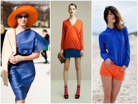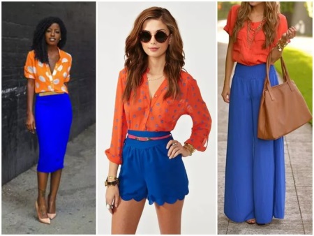 Strict blue surrounded by the primary colors with which it forms a triad (it is red and yellow), or in a “duet” with the opposite color (orange) allows you to create a vivid and memorable image. This can be done using accessories or by combining such colors in clothes. Blue in this version is perfect for an informal atmosphere and a carefree pastime.
