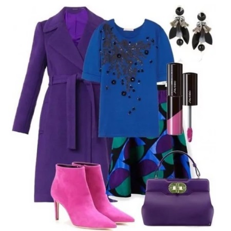 The choice of combinations of neighboring colors suggests that the scheme of combinations of similar colors in clothing is used. The use of such a scheme for choosing clothes and making sets does not exclude the addition of gray, white and black.