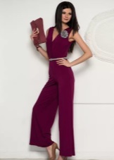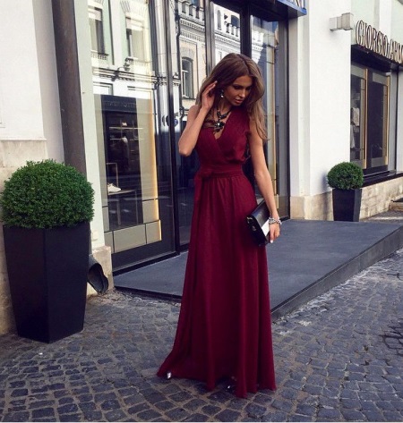 - A flowing dress made of dark burgundy silk emphasizes the solemnity of the image. A V-neckline and light flowing folds add unique femininity and charm. To emphasize the luxury and chic of the dress, black accessories are used: a clutch bag and a massive necklace.