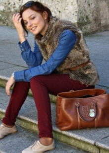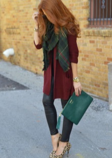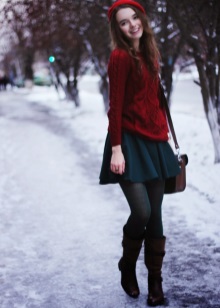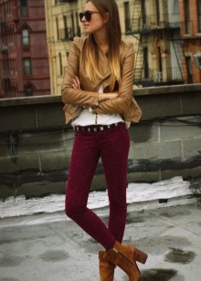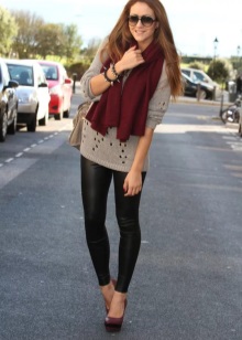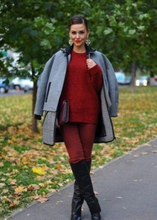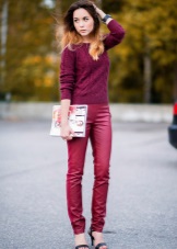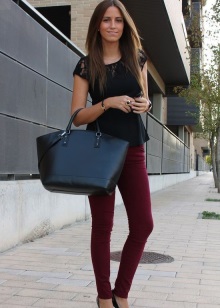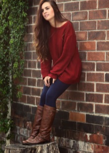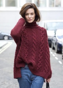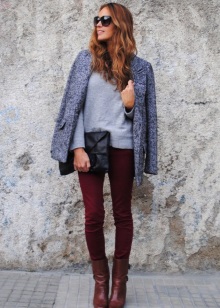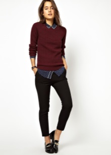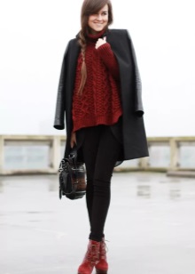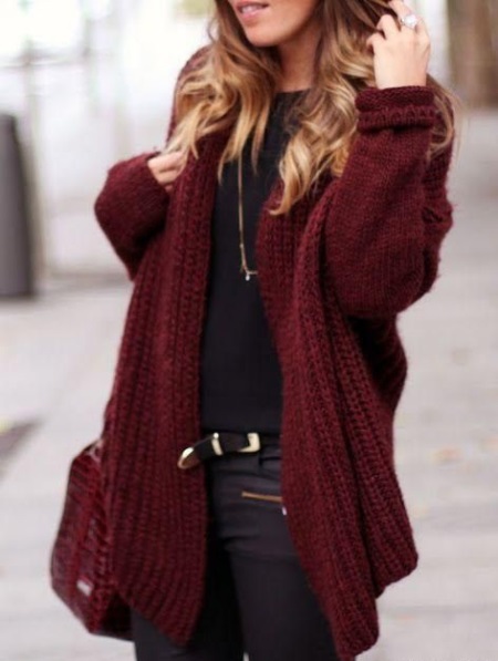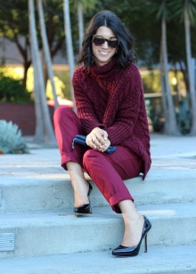 - The burgundy wool jumper seems even more comfortable because of the large knit. It is he who adds to the set of narrow black jeans and a blouse to match the zest and elegance, diluting the color unity. Golden details do not catch the eye, but only set off a warm, feminine image, preventing it from becoming boring.
