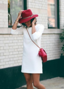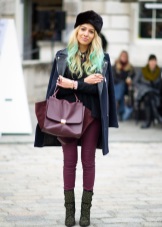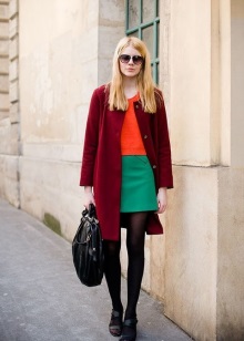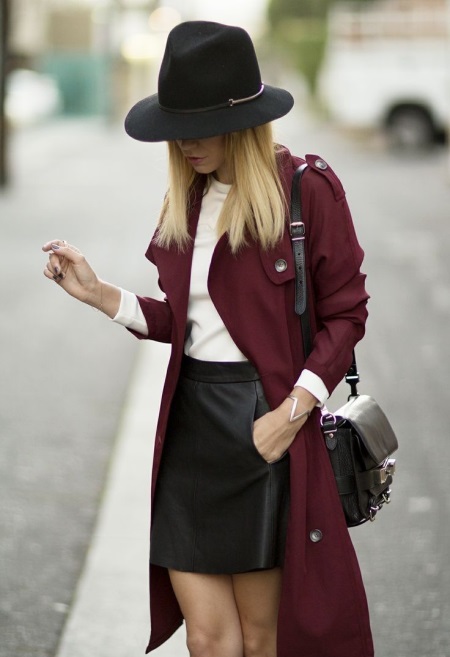 - The combination of three classic colors attracts the eye due to its purity and richness. A narrow black skirt and white blouse look very restrained. A burgundy elongated coat makes the kit look fashionable and adds chic. The hat becomes the highlight of the outfit, diluting the classic look. With her, the whole outfit becomes more youthful and flirty.