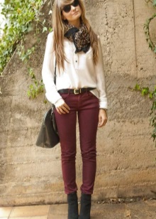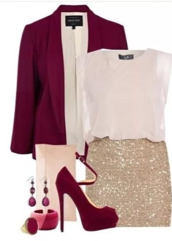 So, an outfit consisting of white and burgundy in equal quantities will look advantageous during the day. White perfectly emphasizes the depth of burgundy, its sophistication and conciseness. And the wine shade will make white clothes become even brighter, giving extra shine thanks to the blue tint. Such an outfit is perfect for work, but it will be no less appropriate for a walk, date or business meeting.