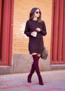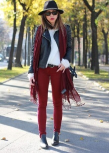 For relaxing, walking or meeting friends, a large knit sweater in a shade of burgundy will be a good choice. This model makes the image cozy and delicate, and in wine tones it is able to produce an even warmer, warmer impression. This sweater looks great with black or navy blue jeans.