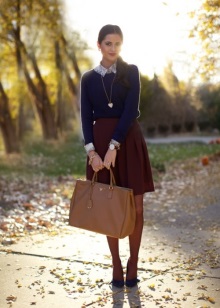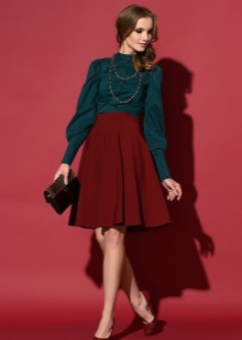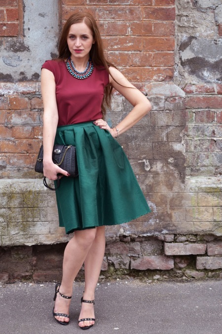 - Both the blouse and the skirt in this outfit are made in dark, noble shades. Despite the fact that they contrast with each other, the image looks solid and very elegant. A fluffy bell skirt eliminates the outfit of excessive rigor. A necklace interspersed with green, burgundy, and violet serves the same purpose. To ensure that the image does not turn out to be flashy or excessively bold, the accessories are very restrained - a classic black bag and open, romantic sandals on a small heel in tone. This outfit can be called universal: it is suitable for walking, and for work, and for evening out.