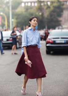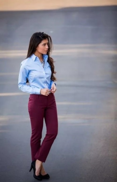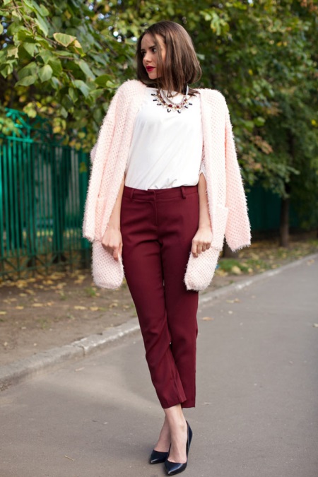 Burgundy color is perfect for office staff. It is saturated enough to attract attention, but not bright and not flashy, therefore it does not violate the business dress code. For work, it is worth choosing trousers or a burgundy skirt. This part of the wardrobe is universal: you can combine it with blouses and jumpers of any color, depending on the mood and impression you want to make.