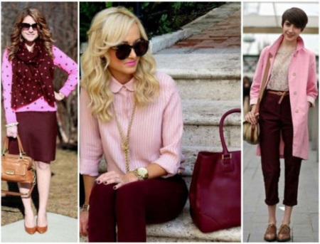 Despite the fact that the combination of burgundy and pink is quite unusual, stylists really like these outfits. The color saturation of burgundy will emphasize the romance and tenderness of pink shades. Powdery shades of pink in tandem with a dark wine tint will create a luxurious, but at the same time unpretentious look, suitable for any event.