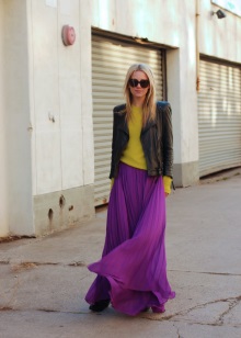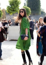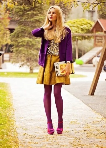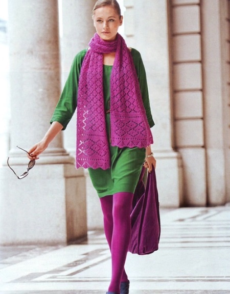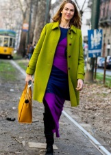 In one look, the related shades of violet diluted with a dress of a juicy green shade perfectly combine. A great solution when you want to fill your everyday look with bright colors.