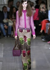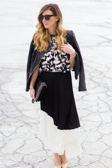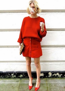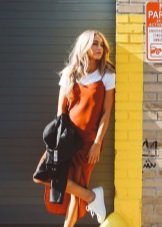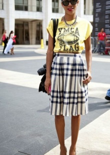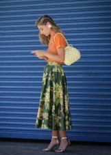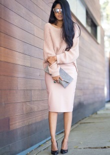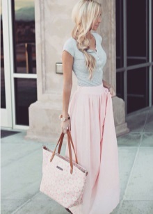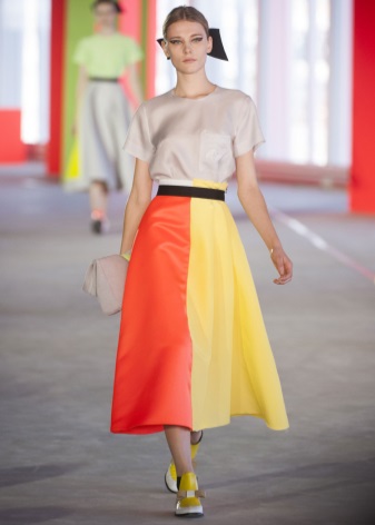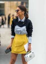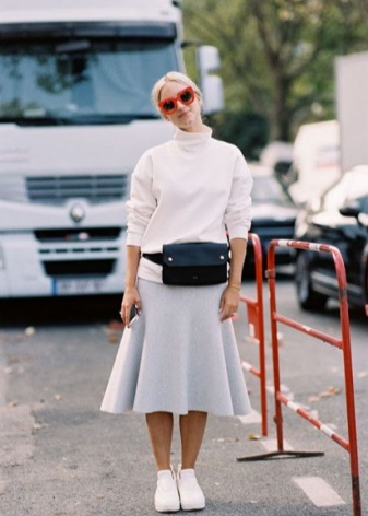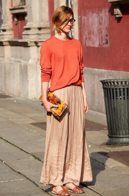 An unexpected combination that looks great in one look. The skirt is a salmon-colored sun and a swamp shirt. Shoes and handbag are matched to the color of the shirt, so the skirt serves as a bright spot of the image, focusing on yourself. This technique is worth adopting if you want to add the missing volume to your hips.
