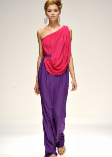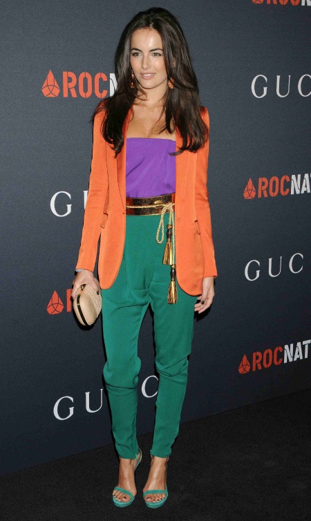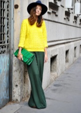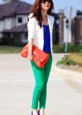 Pants with a high waist malachite color, a bright purple top, which can be replaced with a plum, and an orange jacket. A great solution for a party and for publication. The image is complemented by high-heeled sandals matching the trousers, golden belt, and a small golden clutch.