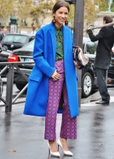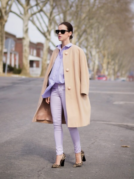 Very gentle spring look. Violet skinny, a pale blue shirt, camel coat and leopard boats, which in this image look completely not vulgar, but very stylish.