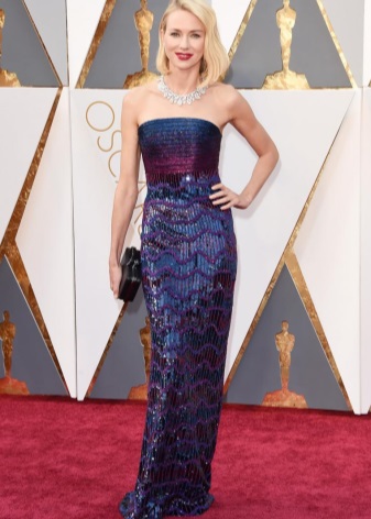 Shoes and accessories made of metallic leather are in fashion today, so gold shoes will be a great addition to an evening dress, such as an eggplant shade. A pendant on a long chain and a clutch decorated with sequins will complement the image.