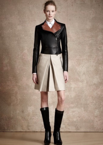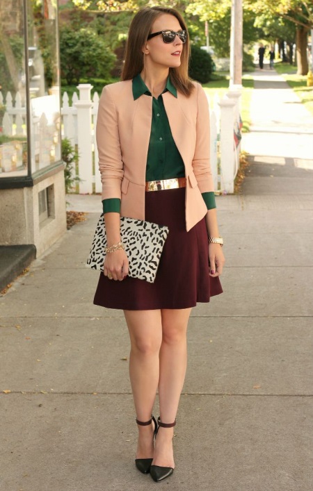 An interesting combination of a dark green shirt, a cherry sun skirt and a peach blazer. All shades are a little muffled, so they do not argue with appearance.The image is complemented by black shoes with a pointed toe and a black and white clutch.