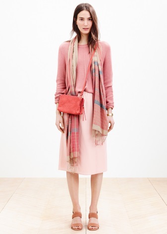 - Warm shades of pink are formed from orange and red. These are all colors with an admixture of peach, coral, flamingo, strawberry and salmon. These shades are best combined with soft, light colors, but also reveal in combination with cool blue. They can be worn with beige and brown colors, olive, khaki, gray-lilac.