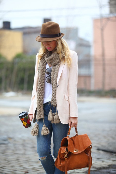 It is not necessary to put on bright clothes to get an interesting harmonious look. Blue jeans, a white T-shirt, a milk-colored jacket. Nothing remarkable, right? But the image is radically changing, thanks to accessories. Brown hat, knitted cappuccino scarf and brick bag. The result was a very stylish outfit!