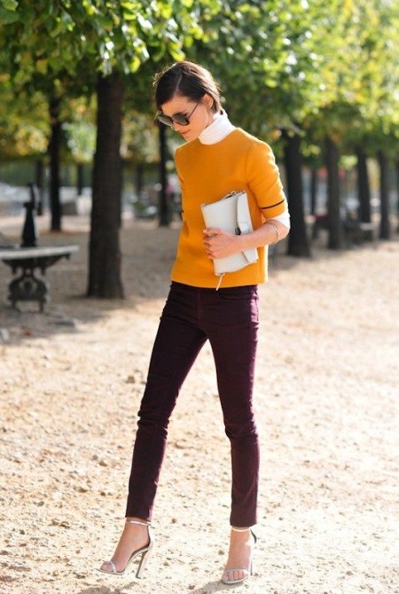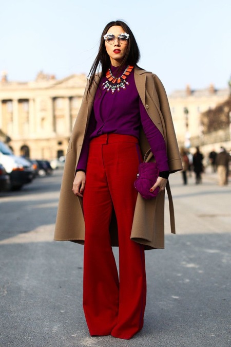 If you want to get a catchy and luxurious look, combine ripe berry pants with a blackberry shirt in one look. To prevent this combination from looking too flashy, complete the look with a coffee-colored coat that will soften the look.