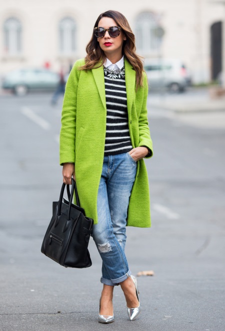 When you want bright colors, add a lime coat to a relaxed look in a casual style. And to make the look even more spectacular, wear metallic steel-colored boats.